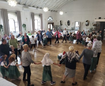 Po skończonym programie artystycznym naszym Drogim Gościom zaśpiewaliśmy Sto lat i życzyliśmy im wszystkiego dobrego na kolejne lata a przede wszystkim dużo zdrowia. Przedszkolaki wręczyły upominki i zaprosiły Seniorów do wspólnej zabawy muzyczno- tanecznej. Serdecznie dziękujemy Państwu Patoła za poczęstunek dla dzieci i gościnność.