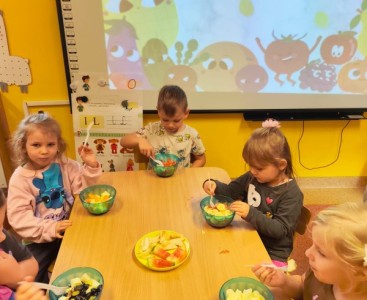 Można śmiało powiedzieć, że zadanie wykonały doskonale. Podczas robienia sałatki kształciły odpowiednie nawyki żywieniowe, rozwijały kreatywność, wyobraźnię oraz dbałość o higienę. Okazało się, że dzieci jednak lubią owoce, a najlepiej smakuje danie wykonane własnoręcznie.