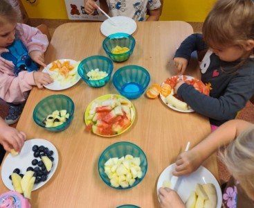 W piątek 17 października przedszkolaki świętowały Światowy Dzień Owoców i Warzyw. Po starannym umyciu rączek i umyciu owoców wszyscy zabrali się do pracy. Dzieci samodzielnie kroiły ulubione owoce i wykonały z nich sałatkę.