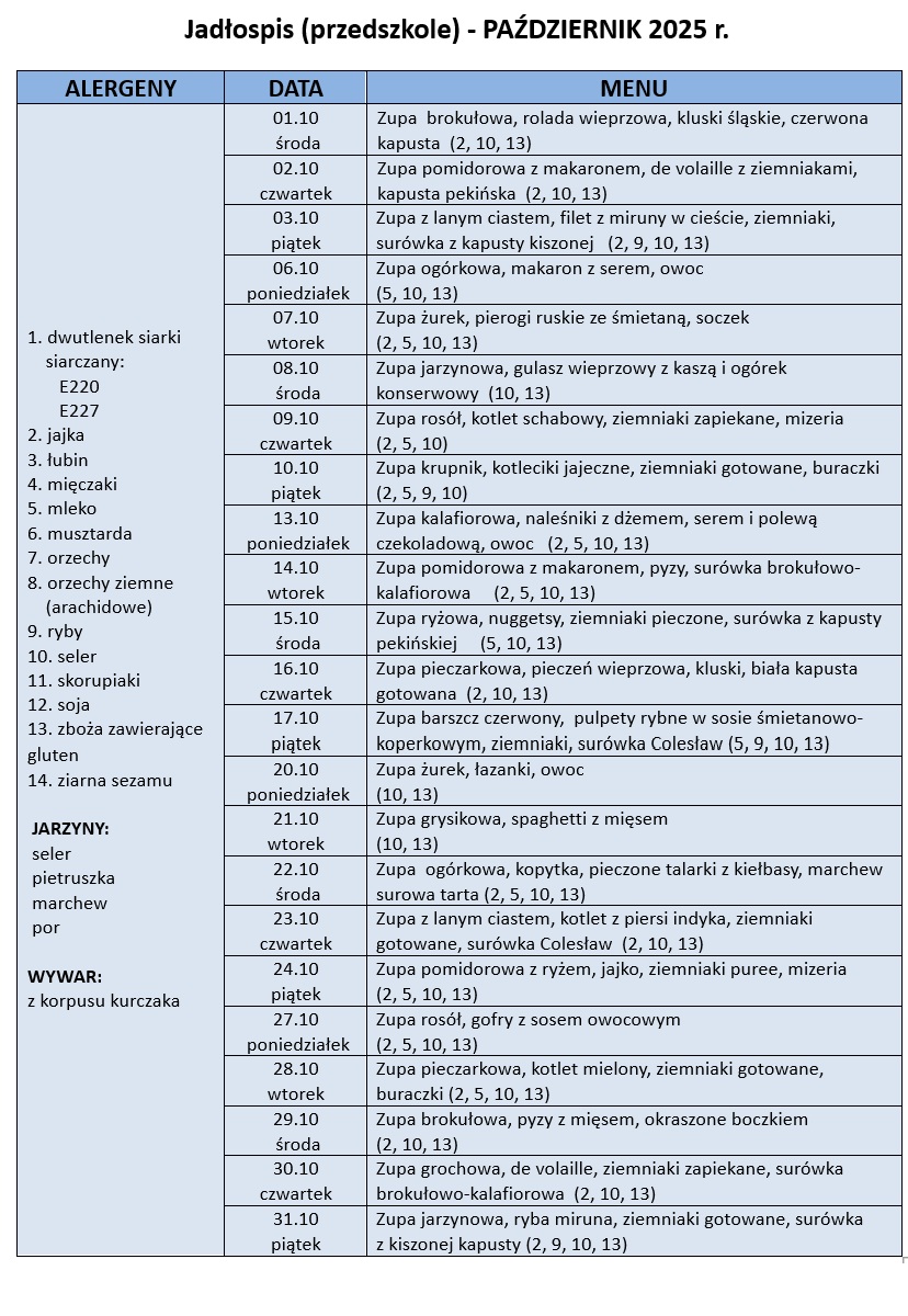 - Jadłospis - październik 2025 r. (przedszkole) (PDF, 114.33 KB, ilość pobrań: 4)