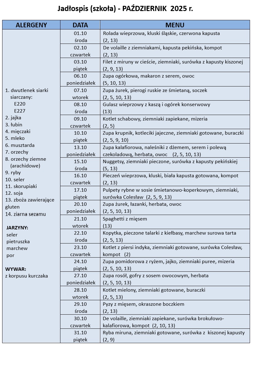 - Jadłospis - październik 2025 r. (szkoła) (PDF, 113.93 KB, ilość pobrań: 8)