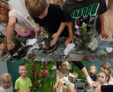 Dzieci podziwiały również drewniane ptaki i owady w gablotach, wiernie odwzorowujące naturę. Po edukacyjnej części na wszystkich czekały pyszne kiełbaski z grilla oraz wspólne biesiadowanie z przedszkolakami z Warmątowic – pełne śmiechu, rozmów i integracji. Podczas warsztatów ekologicznych prowadzonych w sali zabaw Kuleczka starsze dzieci stworzyły własny „las w słoiku”, a młodsze wykonały „eko misia”. To był dzień pełen wrażeń, wiedzy i radości.